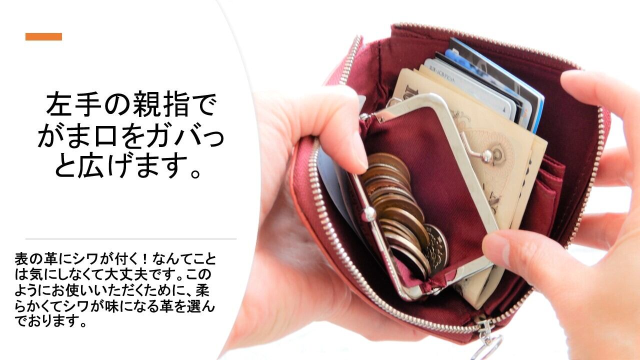 この財布は小銭入れの開口部を最大限広げられ、コンパクトながらも小銭が見やすく・出しやすく・しまいやすいデザインになっています。また、外側からはがま口が見えないので、「がま口を使いたいけど見た目に抵抗がある」と感じている方にもおススメです。
